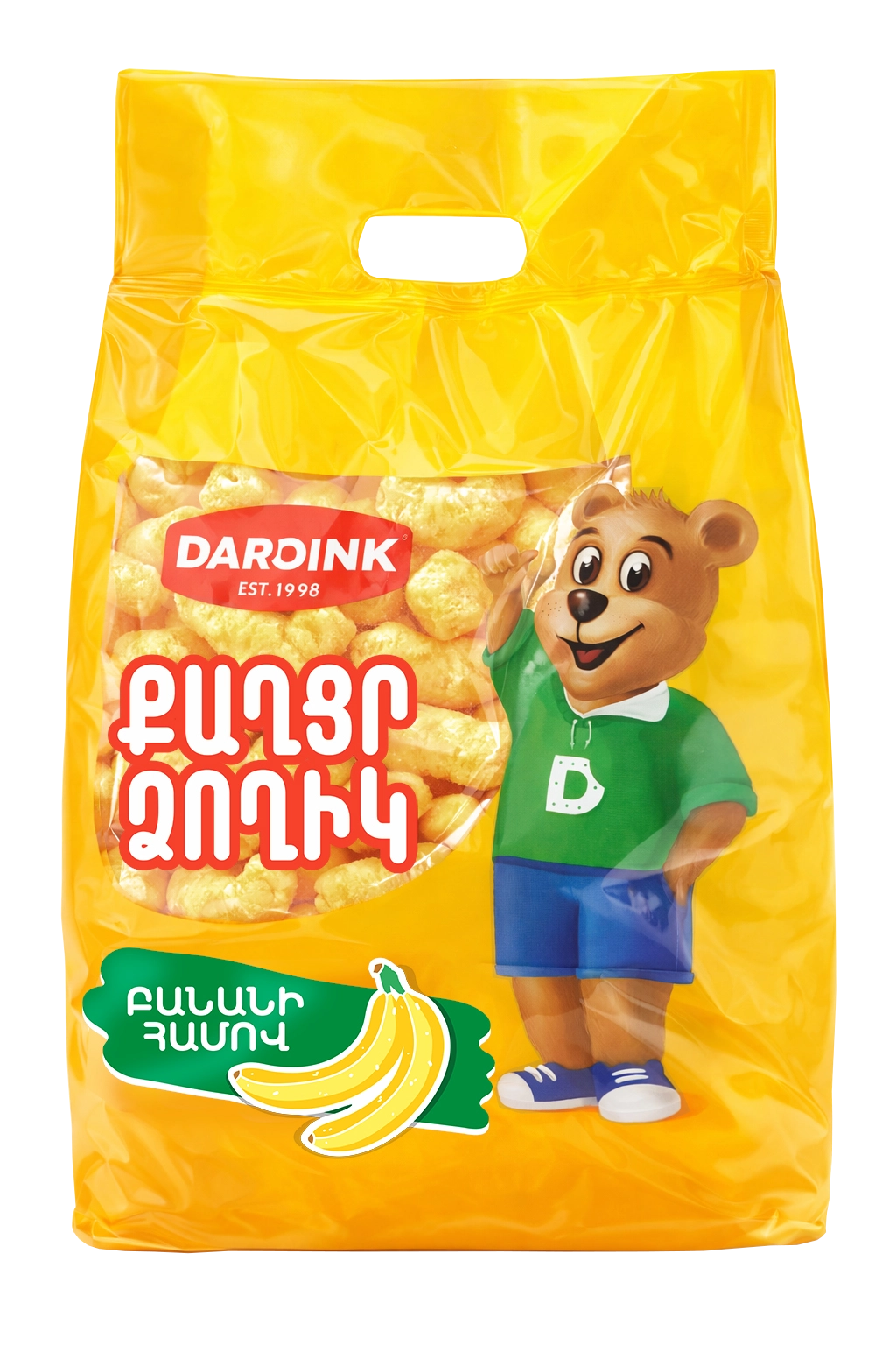 Բաղադրությունը՝ սպիտակաձավար, շաքարավազ, արևածաղկի ձեթ (զտած հոտազերծված),կերակրի աղ, սննդային բուրավետիչ՝ «Բանան»: Պահել 35°C ոչ բարձր և 65-75% օդի հարաբերական խոնավության պայմաններում: Արտադրված է Հայաստանում: