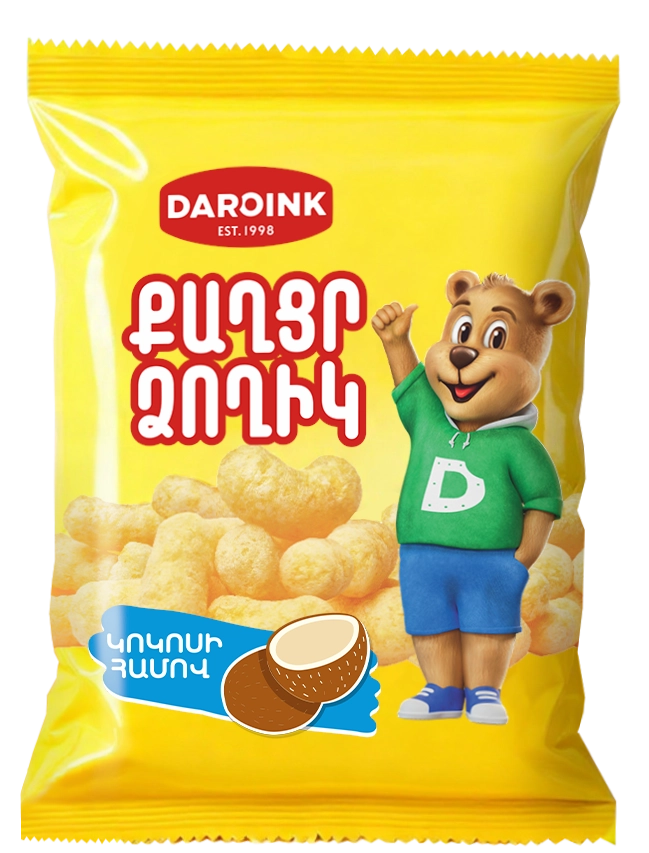 Բաղադրությունը՝ սպիտակաձավար, շաքարավազ, արևածաղկի ձեթ (զտած հոտազերծված),կերակրի աղ, սննդային բուրավետիչ՝ «Կոկոս»: Պահել 35°C ոչ բարձր և 65-75% օդի հարաբերական խոնավության պայմաններում: Արտադրված է Հայաստանում: