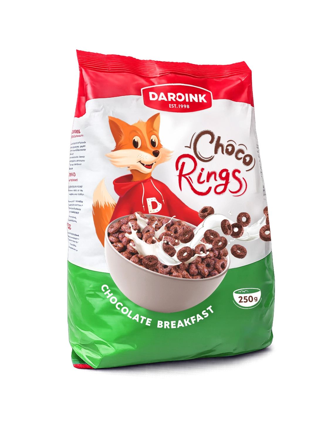 Состав: зерновые (пшеница, рис, кукуруза), питьевая вода, кукурузный крахмал, какао-порошок, кукурузный крахмал, сахар, солодовый экстракт, соль, пищевой ароматизатор: ванилин. Хранить при температуре не выше +35 °C и относительной влажности не более 65-70%. Произведено в Армении.